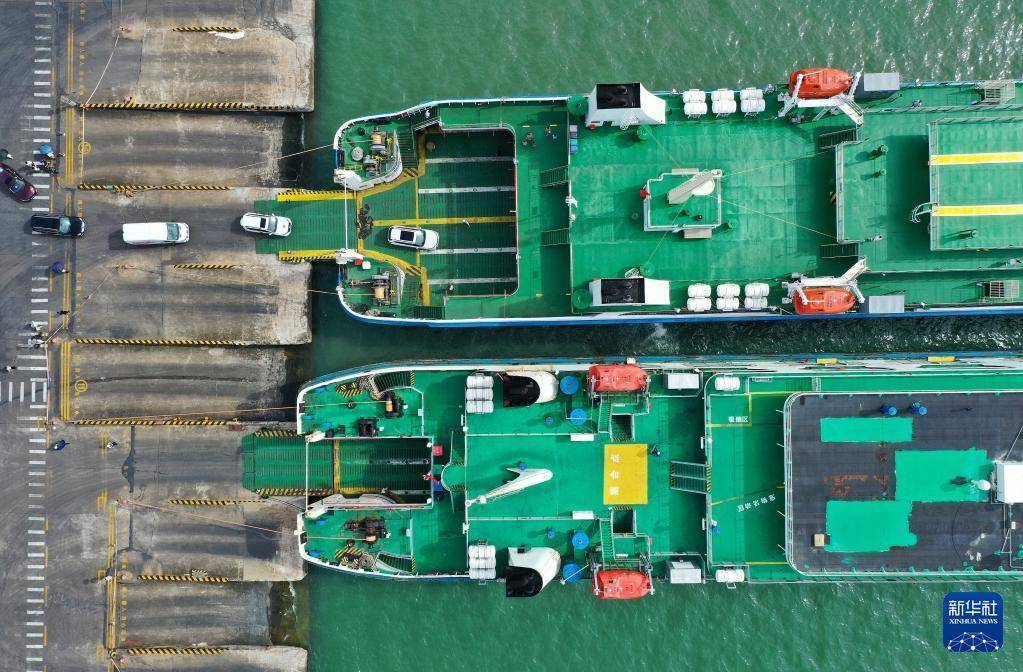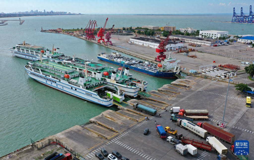 10月4日,在海南省海口市秀英港,客滚船在停运前装卸乘客、车辆(无人机照片)。