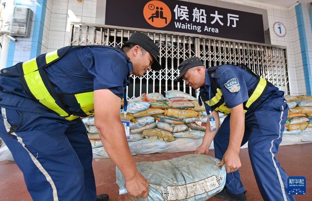 10月4日,在海南省海口市秀英港,工作人员在候船大厅外布设防水沙袋。